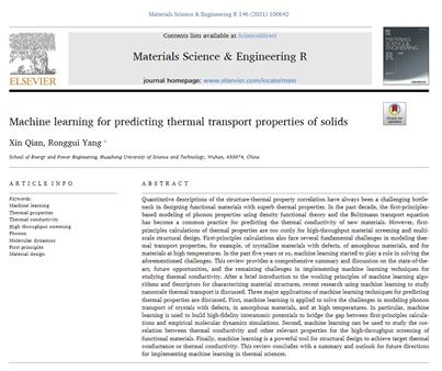 (通讯员 李牧川)2021年9月,能源和材料领域顶级期刊Materials Science and Engineering R (影响因子IF=36.214)刊发题为“Machine Learning for Predicting Thermal Transport Properties of Solids”的综述文章,第一作者和通讯作者分别为公司钱鑫教授和杨荣贵教授。