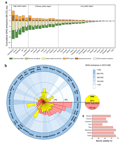 为了实现《巴黎协定》中商定的将全球温度上升有效地限制在2°C或1.5°C的目标,负排放技术(NETs)的广泛应用被认为是必不可少的。两种主要依赖光合作用的NETs因能同时提供能源和潜力巨大而备受瞩目:(1)耦合碳捕集与封存(CCS)的生物能源技术(BECCS),以及(2)生物炭(Biochar)的生产和封存。考虑到BECCS可能还需要多年时间才能成熟,该研究首先关注了更容易在中国实施的生物炭(Biochar)负碳技术:生物质中速热解多联产(BIPP)。该技术可生产生物炭的同时提供有较好经济性的可燃气和电力。研究发现,若全国碳市场建立,BIPP系统无需补贴即可盈利,若立即应用,其在全国范围内的应用可以使2030年单位国内生产总值的碳排放量比2005年减少2-61%,同时还可以显著减少空气污染物的排放。在2030年之后,考虑BECCS和Biochar的耦合利用和协调发展,到2050年可累计减少的温室气体排放可高达8620百万吨二氧化碳当量,对全球BECCS温室气体减排目标的贡献率为13%-31%。耦合情景比单独BECCS情景至2050年减排量多出近4555百万吨。该研究主要阐述中国负碳技术的部署对实现国家和全球温室气体减排目标的重要影响。该项工作得到了国家自然科学基金,煤燃烧国家重点实验室基金及中欧清洁与可再生伟德BV1946官网双一流研究基金的支持。