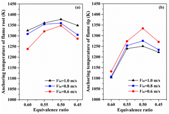 图2 三维数值模拟得到的不同进气速度和当量比下火焰根部和顶部的锚定温度