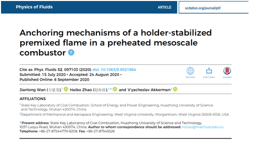 2020年9月,公司煤燃烧国家重点实验室赵海波教授团队在流体力学国际著名期刊Physics of Fluids在线发表了重要研究进展“Anchoring mechanisms of a holder-stabilized premixed flame in a preheated mesoscale combustor”研究论文,并被选为封面文章(Featured Article)。万建龙讲师为第一作者,赵海波教授为通讯作者,伟德BV1946官网煤燃烧国家重点实验室为第一完成单位。