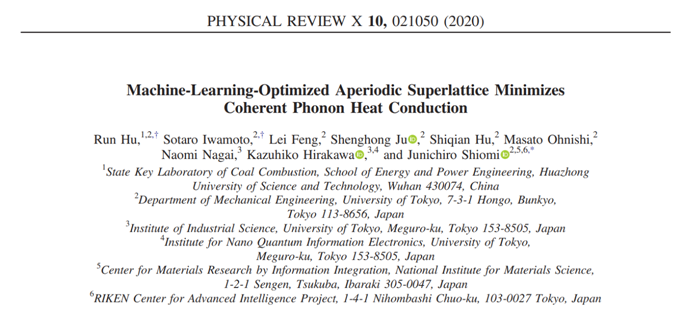 文章信息:Run Hu, Sotaro Iwamoto, Lei Feng, Shenghong Ju, Shiqian Hu, Masato Ohnishi, Naomi Nagai, Kazuhiko Hirakawa, and Junichiro Shiomi, Machine-Learning-Optimized Aperiodic Superlattice Minimizes Coherent Phonon Heat Conduction, Physical Review X, 10, 021050, 2020 (DOI: https://doi.org/10.1103/PhysRevX.10.021050)